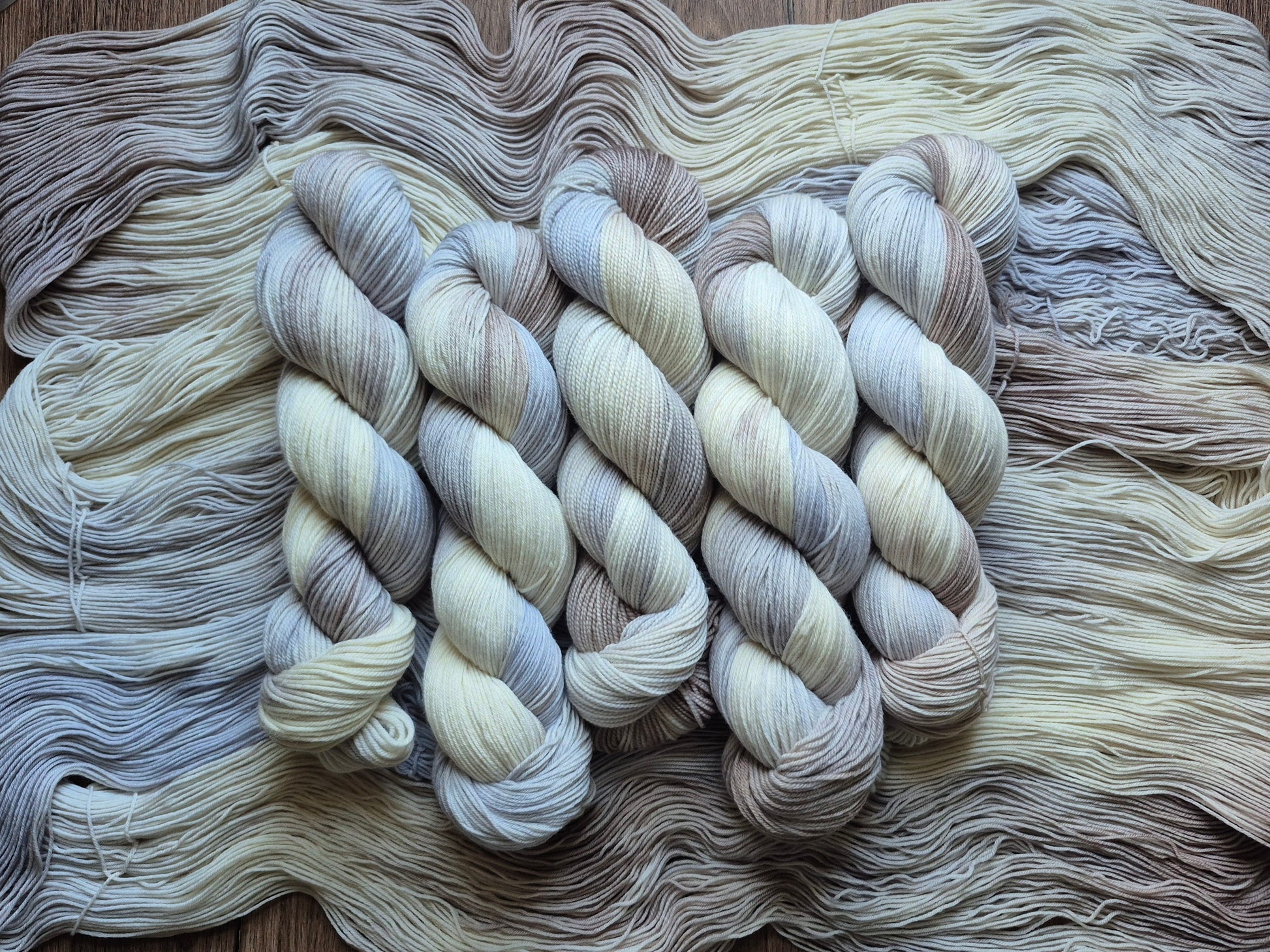 We use professional acid dyes to create beautiful colorways on soft, durable bases. As with all handmade products, slight variation will occur between and sometimes within dye lots. Variation between skeins is normal for hand-dyed yarn.Â